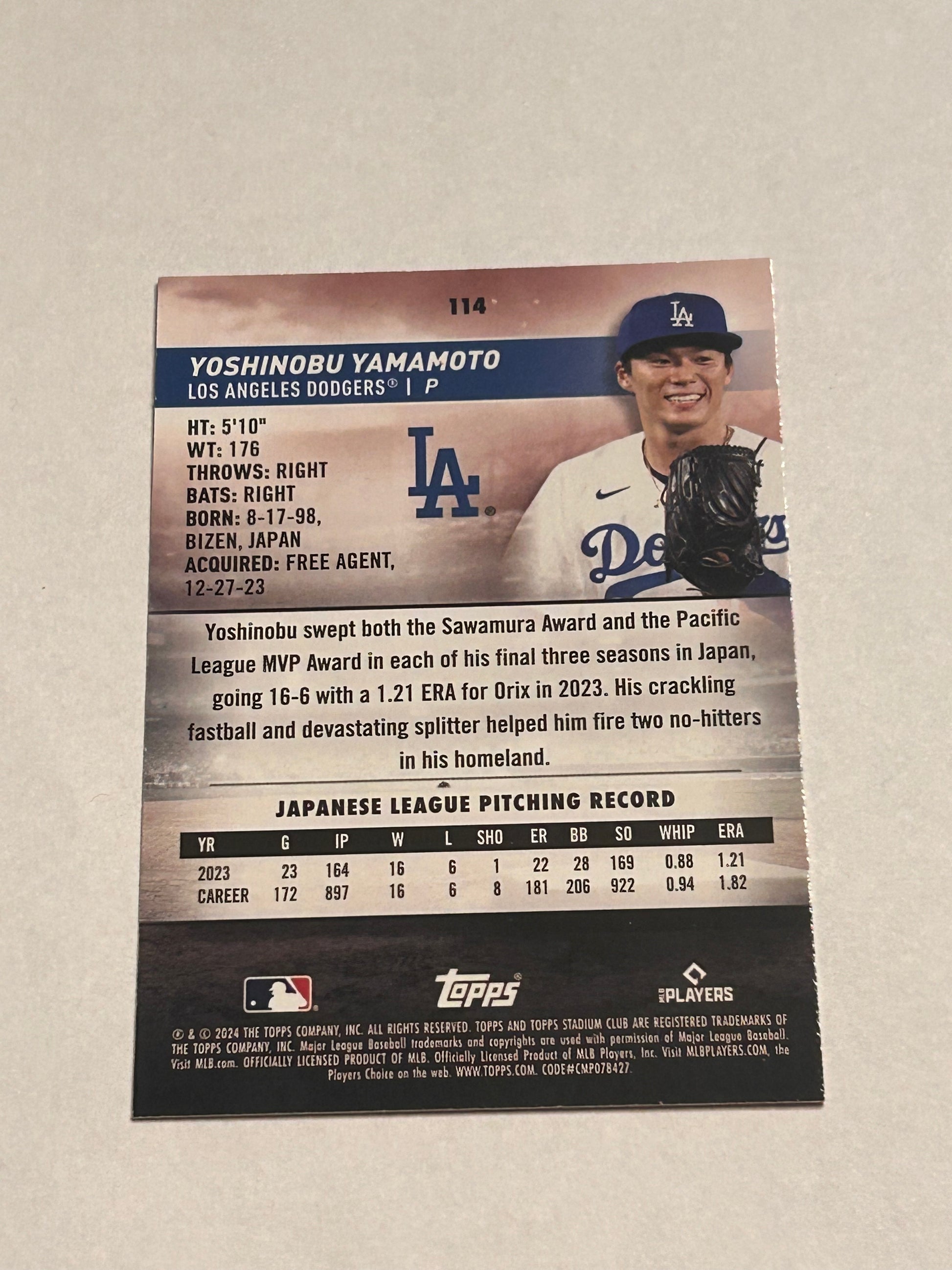 2024 TOPPS STADIUM CLUB Yoshinobu Yamamoto ROOKIE CARD PINK FOIL PARALLEL #114
